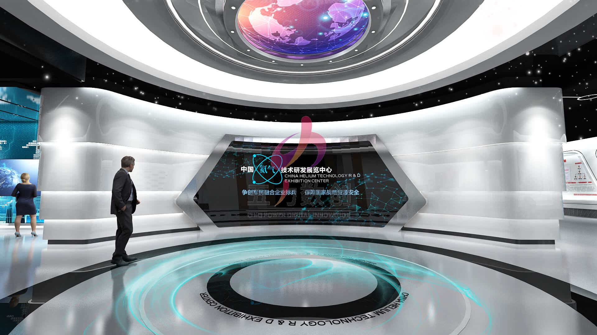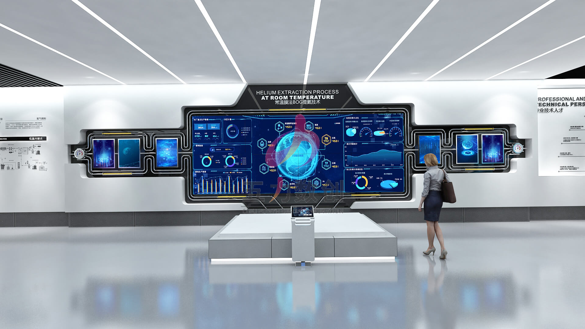 近年來,在能源危機壓力下,加速了能源系統向綠色低碳轉型,新能源行業的競爭日趨激烈。五力數創以科技,數據,智慧方向為思考;結合氦氣工業能源行業獨特性,采用簡潔白色帶有科技屬性藝術裝置搭建應用場景,講述能源戰略布局,世界貿易,生產技術,物流運輸,數字化管理等產業鏈條展示。為瑞華能源集團量身打造個性化的新能源企業展廳。